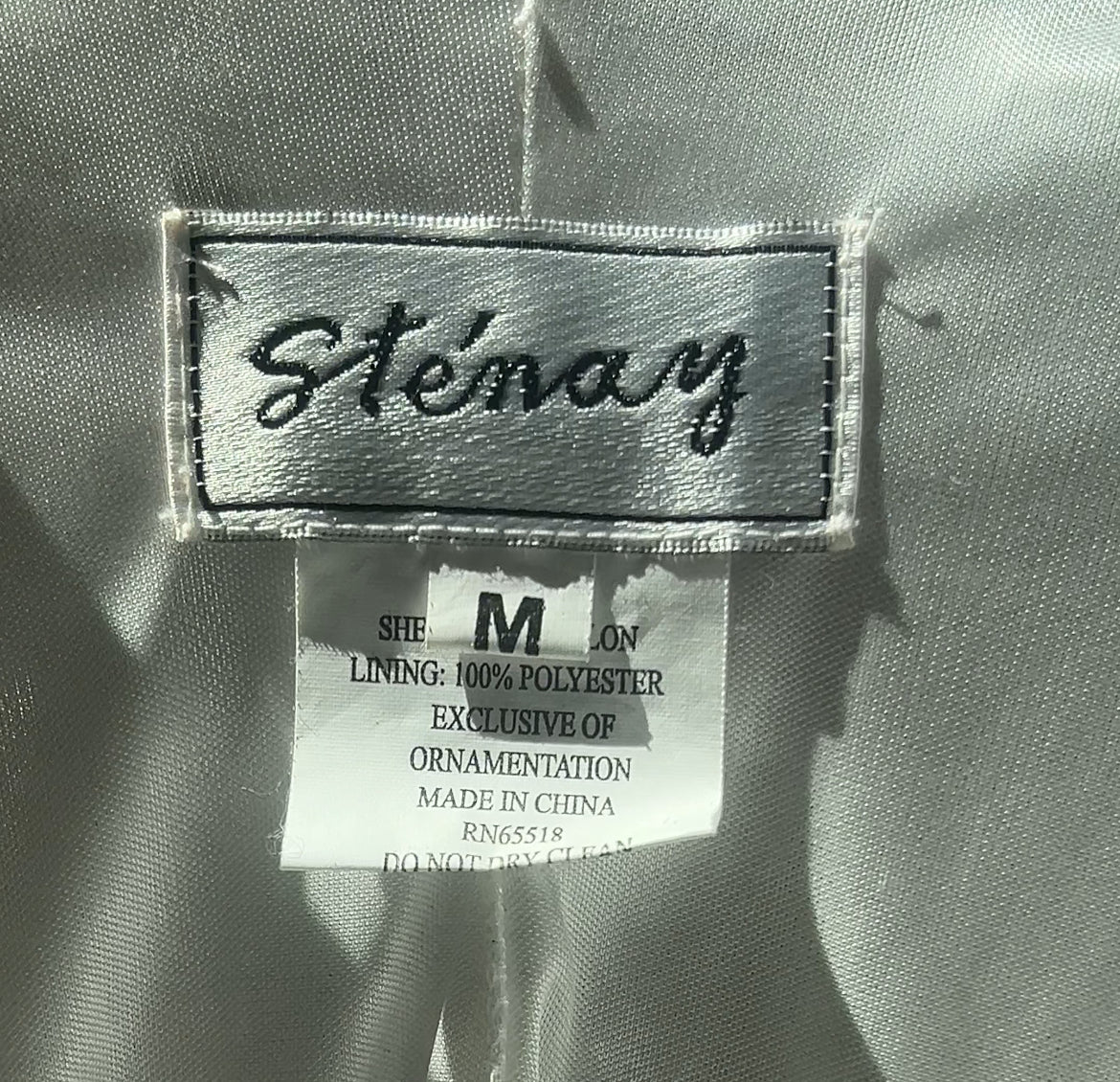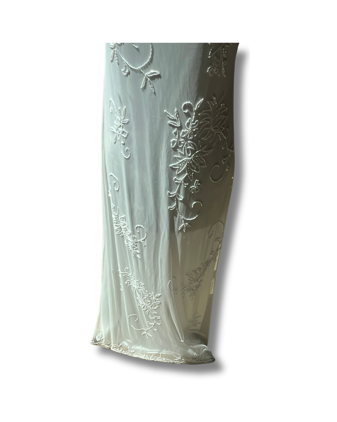An elegant piece of wearable history, this vintage Stenay gown (likely late 80s/early 90s) features delicate white beadwork in swirling floral patterns across a sheer overlay. Designed with a sleeveless silhouette and floor/ankle-length cut, it drapes beautifully for a timeless, ethereal look. The craftsmanship and hand-beading reflect the quality Stenay was known for, making this dress a stunning choice for special occasions, bridal wear, or collectors of vintage formalwear.