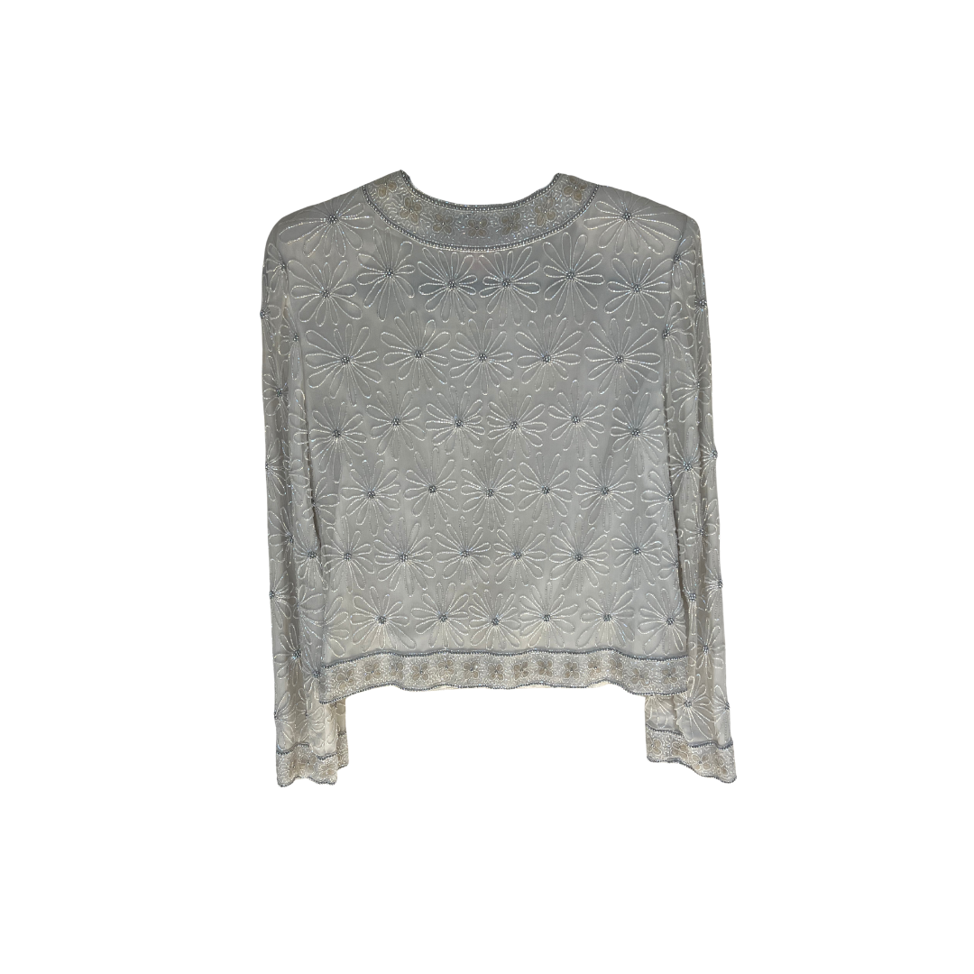Elevate any look with this stunning vintage Papell Boutique jacket, crafted from luxe white silk and adorned with intricate beadwork. Featuring delicate detailing throughout, this timeless piece drapes beautifully and adds instant glamour to any outfit. Perfect for special occasions, evening wear, or styled casually for a chic contrast, it’s a true wardrobe treasure.